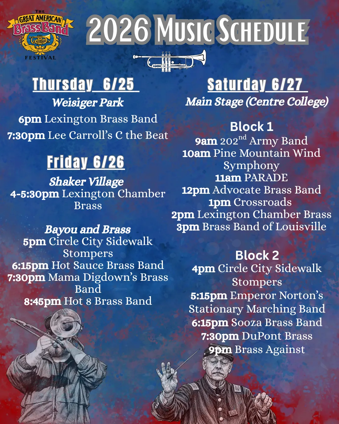 Saturday's music is in two blocks for music of your choosing. We encourage you to attend the entire day for the whole variety, but you can check the schedule and hear what you want to hear. The 1st block is more traditional brass band music with wind ensemble, British brass band, big band, and brass quintet.
